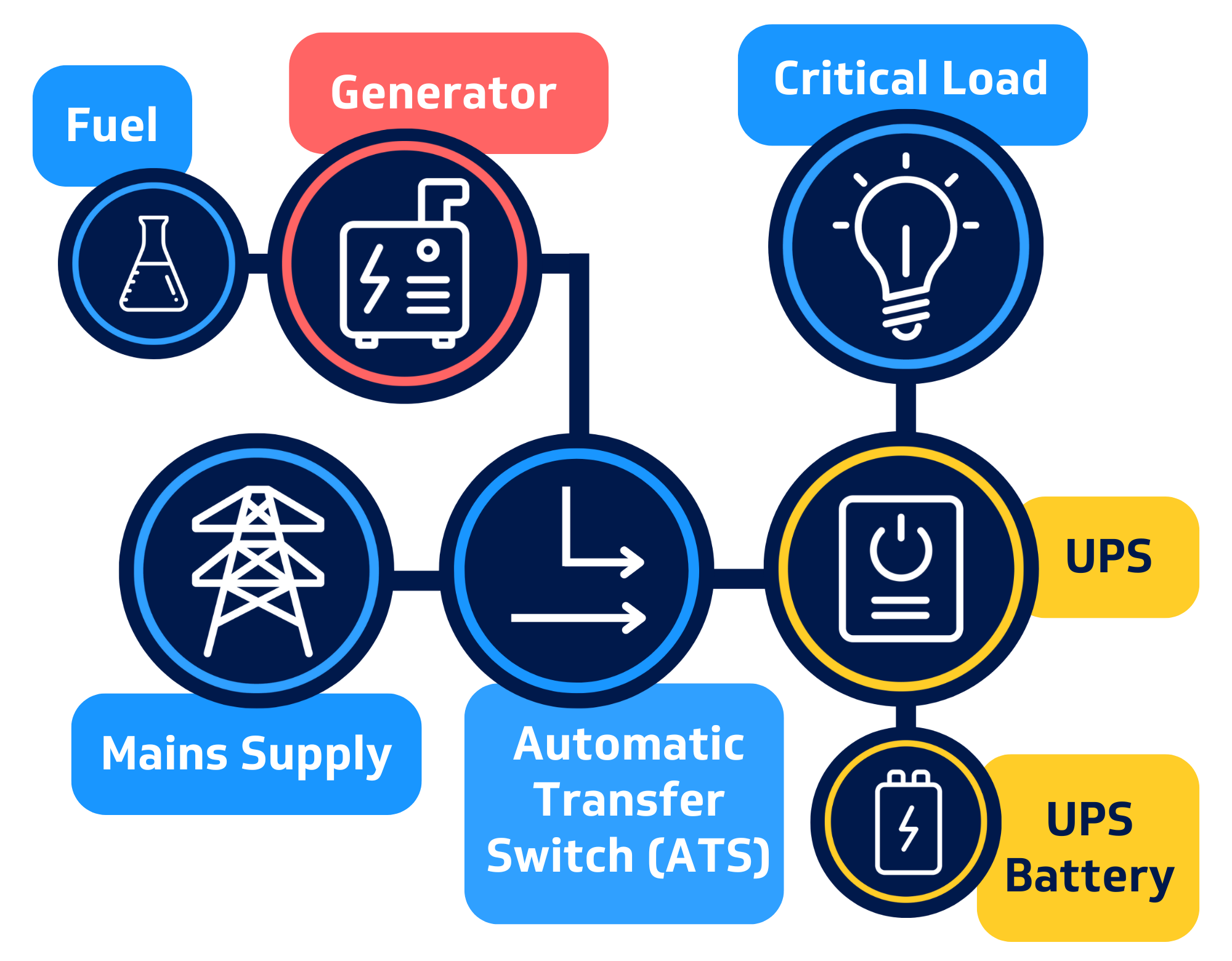 In conventional backup power infrastructure, continuity depends on the seamless interaction between components. The diagram below illustrates how these systems typically work together to protect vital operations from outages: