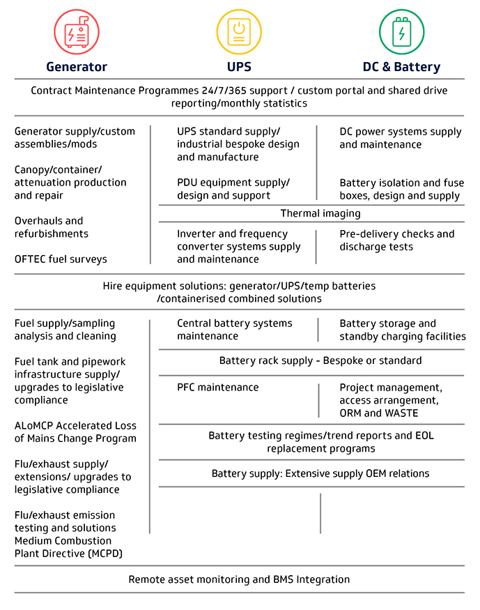 We cover a large range of services and maintenance jobs across generators, UPS, and batteries as highlighted below.